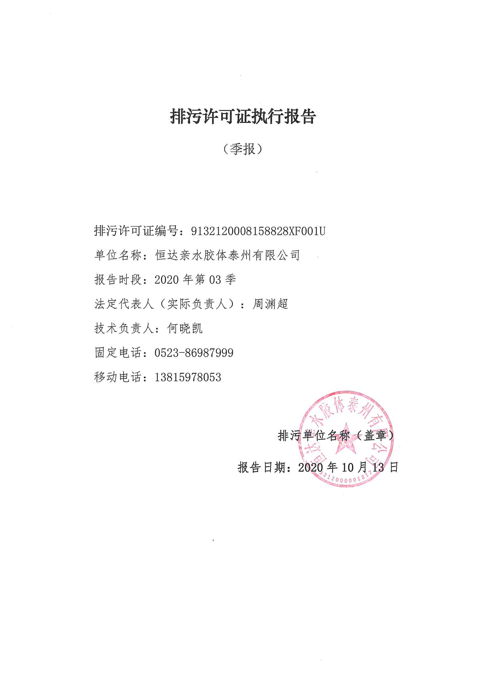 2020三季度排污許可執(zhí)行報告